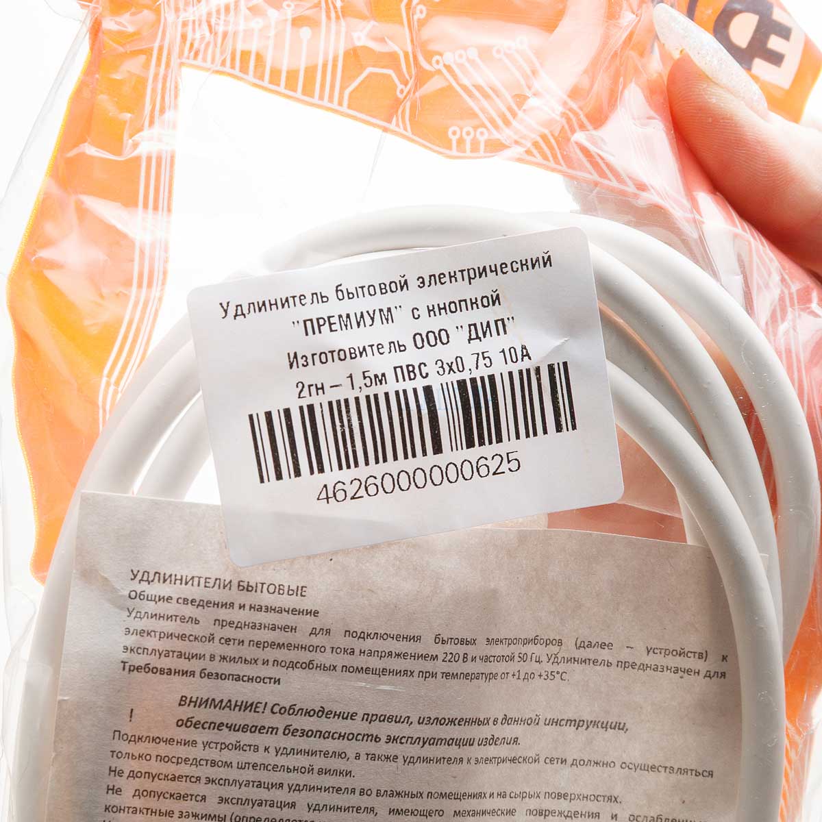 Удлинитель ПРЕМИУМ с КНОПКОЙ 2 гнезда 1,5 метра ПВС 3*0,75 с заземлением